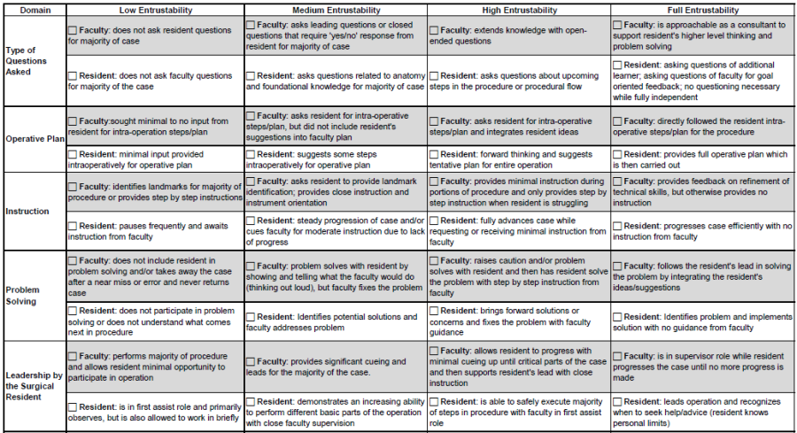 Faculty entrustment and resident entrustability can be measured with the OpTrust entrustment measurement tool. OpTrust is a validated intraoperative entrustment measurement tool which enables trained third-party raters to objectively score faculty entrustment and resident entrustability during intraoperative educational interactions.